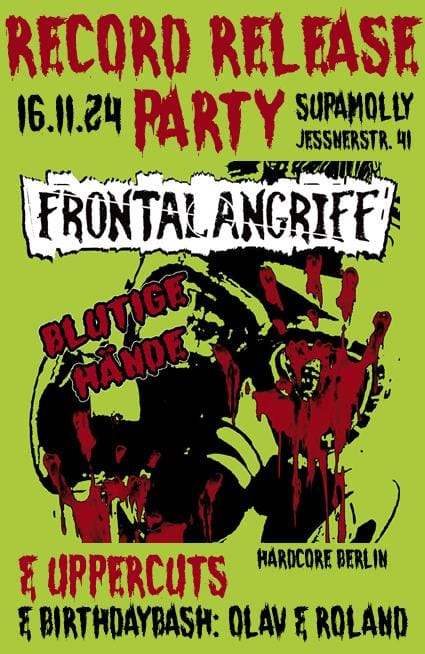 Ansonsten wollen wir euch noch die Record-Release-Party ankündigen, die am 16. November 2024 im Supamolly in Berlin stattfinden wird. Also, seid gespannt auf das neue Album, kauft euch das Ding und feiert zusammen mit Frontalangriff eine denkwürdige Release-Party. Punkrock für immer!