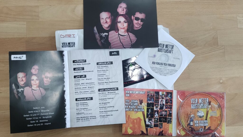 Gönnt euch diese 15 Minuten feinen Deutsch-Punk und kauft euch die EP Kein Vergeben, kein Vergessen von Vier Meter Hustensaft für eure Sammlung. Die Combo macht von den Texten, über die Komposition, Produktion, Mischen und Mastern, sogar die Videos und den Schnitt alles in harter DIY-Eigenregie. Für dieses Album haben sie sich mit NRT-Records noch etwas professionelle Hilfe für das Marketing und den Vertrieb an Bord geholt. Zu recht, denn das Ergebnis kann sich wirklich sehen und vor allem hören lassen.