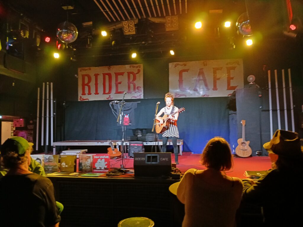 Gelegen ist das Riders Café im Industriegebiet, mit einer sehr schönen langen Bar und einer intimen Größe. Laut meiner Recherche passen bis zu 400 Leute in die Location. Mit dem Auto sind es nur wenige Minuten zur Autobahnauffahrt. Problematisch ist manchmal das „Heimkommen“ nach dem Konzert, da der letzte Bus in der Regel bereits zu Konzert Beginn gefahren ist.