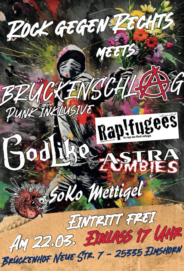 Am 22.03.2025 findet in Elmshorn im Brückenhof das Rock gegen Rechts-Festival statt. Eintritt frei!