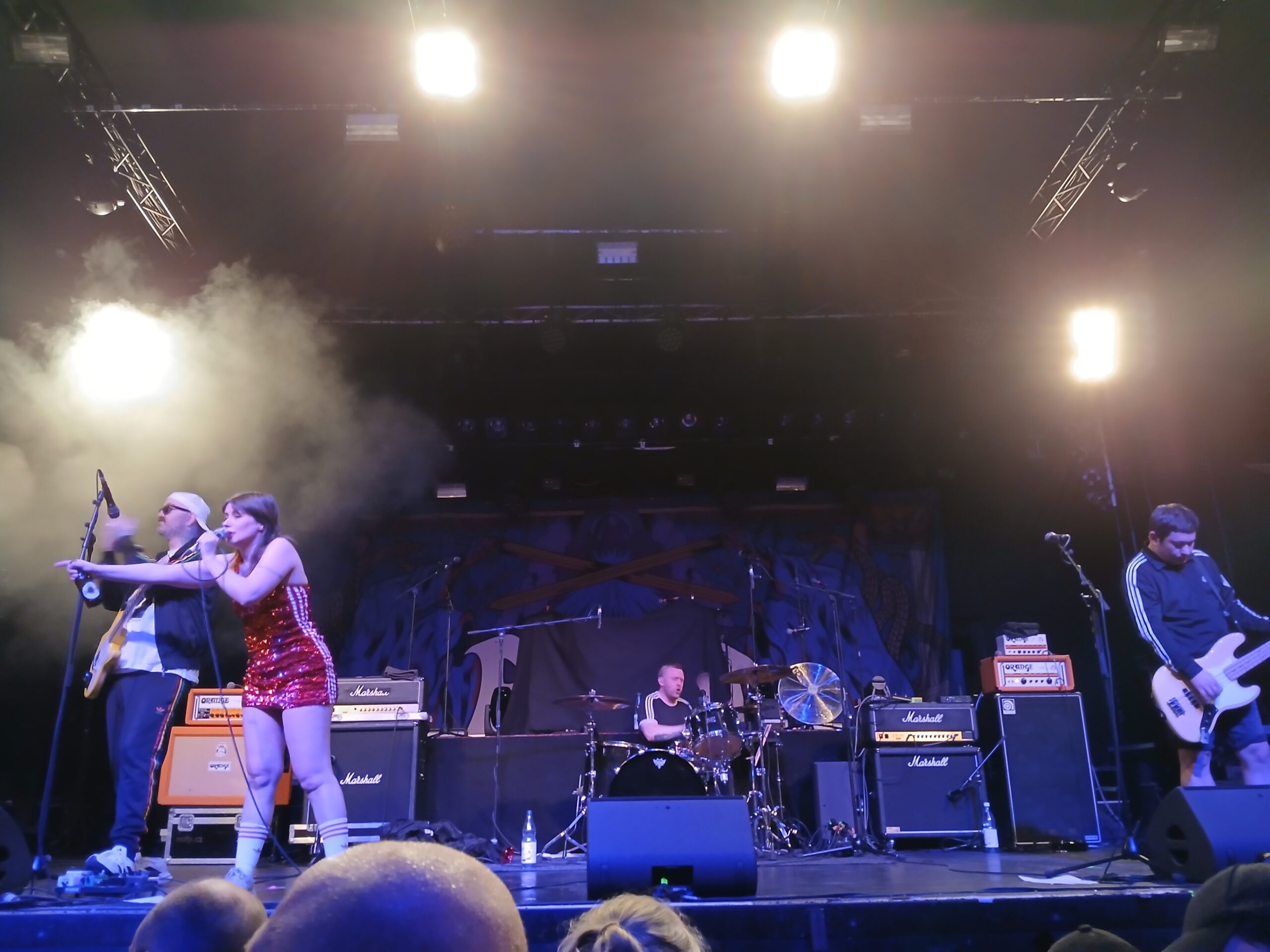 Heute Abend auf der Bühne kommt diese Energie von der ersten Sekunde super rüber. Nikki schreit sich die Seele aus dem Leib und springt auf der Bühne auf und ab, wie man es von Amyl an the Sniffers kennt. Ironischerweise hat sie, wie Amyl, australische Wurzeln. Wir werden gefühlt mit jedem Song zu einem Circle Pit aufgefordert. Zumindest unser harter Kern aus 6-8 Leuten kommt dieser Aufforderung auch nach. Nikki lässt es sich nicht nehmen während des gefühlt 30 Minuten Set zwei mal Stage Diving zu machen.