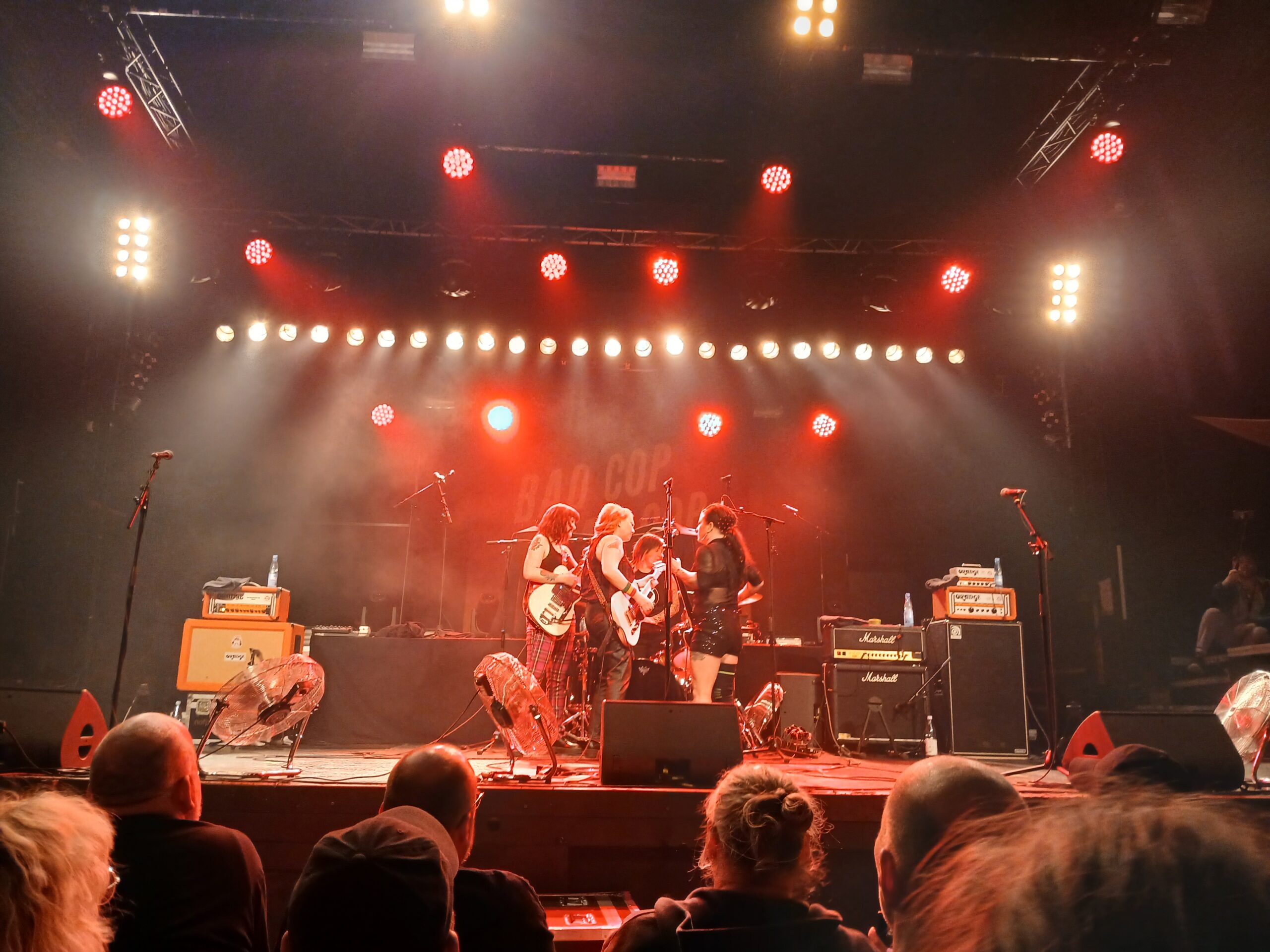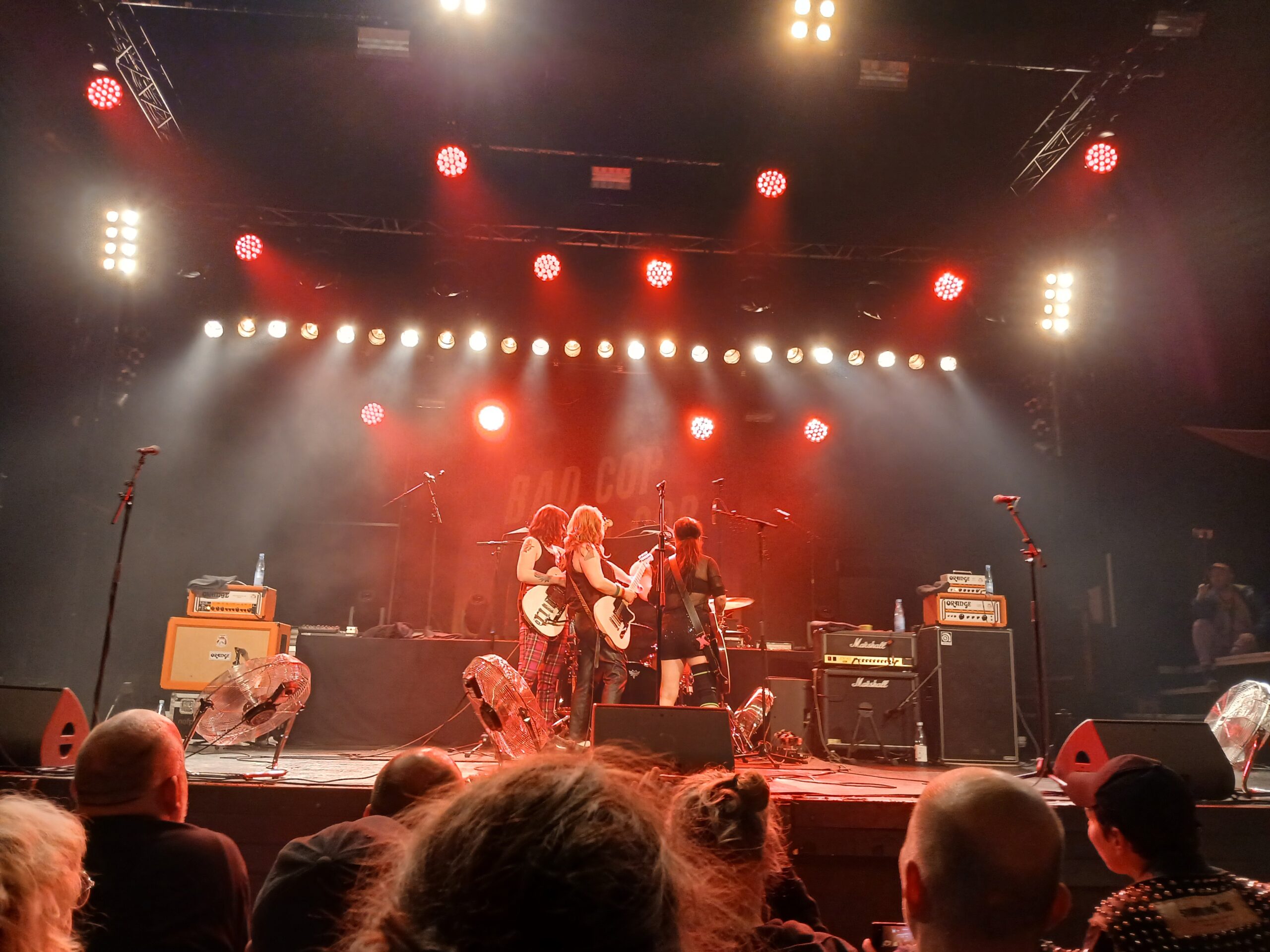 Nun geht es weiter mit Bad Cop/Bad Cop, den vier Damen aus Südkalifornien. Unter Vertrag sind sie beim legendären Label „Fat Wreck Chords“ von Fat Mike. Das merkt man dem Sound durchaus an. Es gibt melodischen und ziemlich politischen Punk Rock in der Tradition von Bands wie zum Beispiel Bad Religion. Von dieser Band hatte ich mir vorher die Alben Not Sorry und The Ride angehört. Es geht um Themen wie Feminismus, die amerikanische Regierung, Flüchtlingskrisen oder auch um mentale Krisen, wie die überstandene Suchterkrankung von Sängerin Stacey Dees.