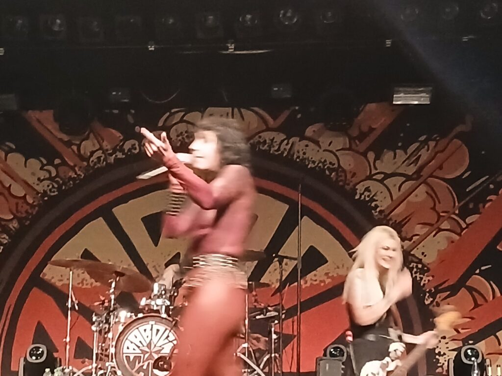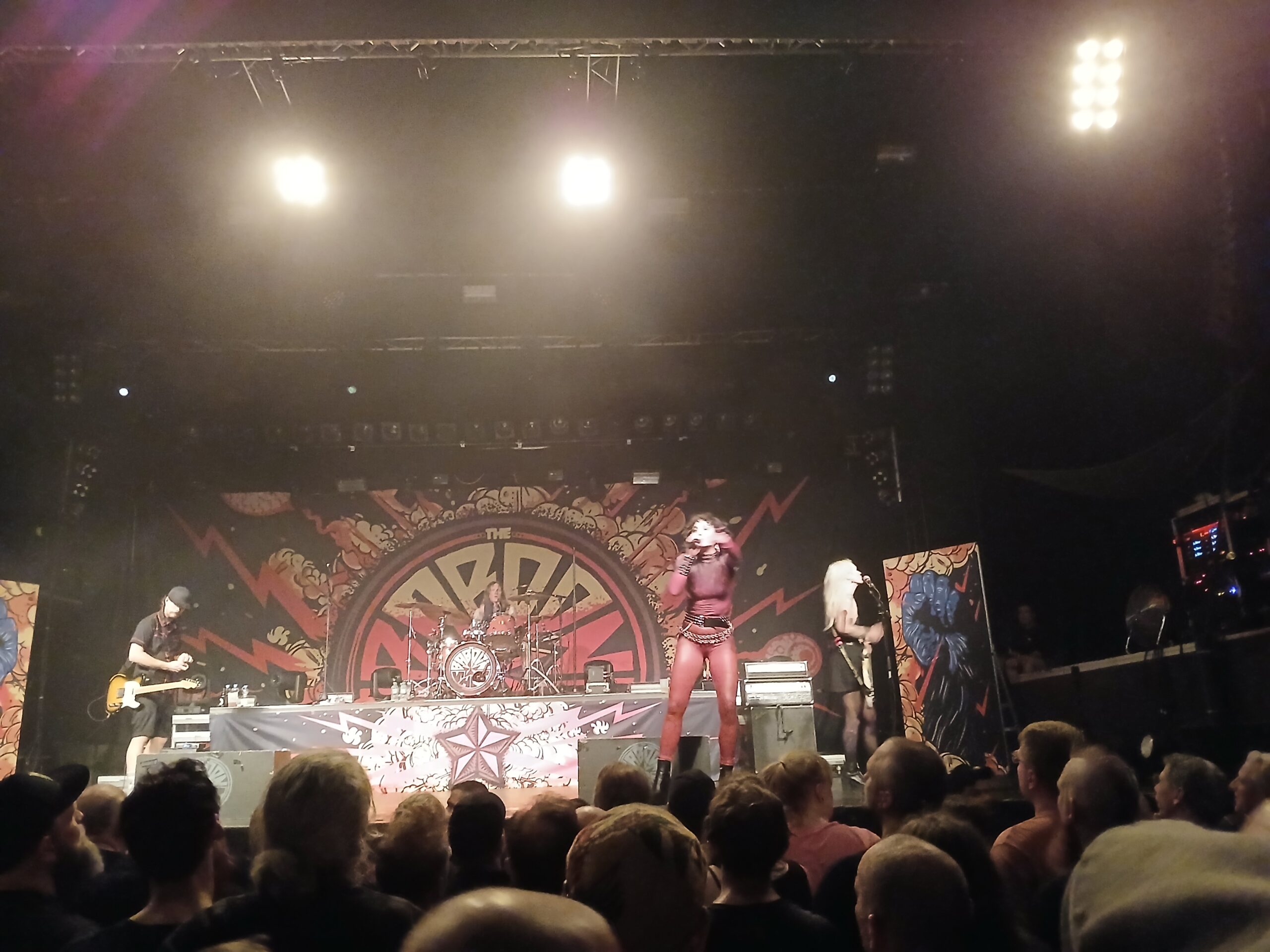 Gegen 20 Uhr geht es los mit Blood Command aus Bergen in Norwegen. Dieses mal hatte ich mehr als genug Zeit, um mich vorzubereiten und hatte mir in den letzten Tage bereits wiederholt deren Alben Praise Armageddonism und World Domination angehört. Eine sehr wilde Mischung. Soundtechnisch geht es für meine Begriffe schon bei den meisten Songs in Richtung Hardcore. Allerdings gibt es auch immer mal wieder Pop, Electro und Metal Elemente. Auf den Alben gibt es sogar teilweise echte Balladen wie Losing Faith die endgültig beweisen, was die Sängerin für eine tolle Stimme hat. Optisch bedient die Band durchaus einen gewissen Trash Vibe, inspiriert von 80er Jahre Action Filmen wie „Blood Sport“.