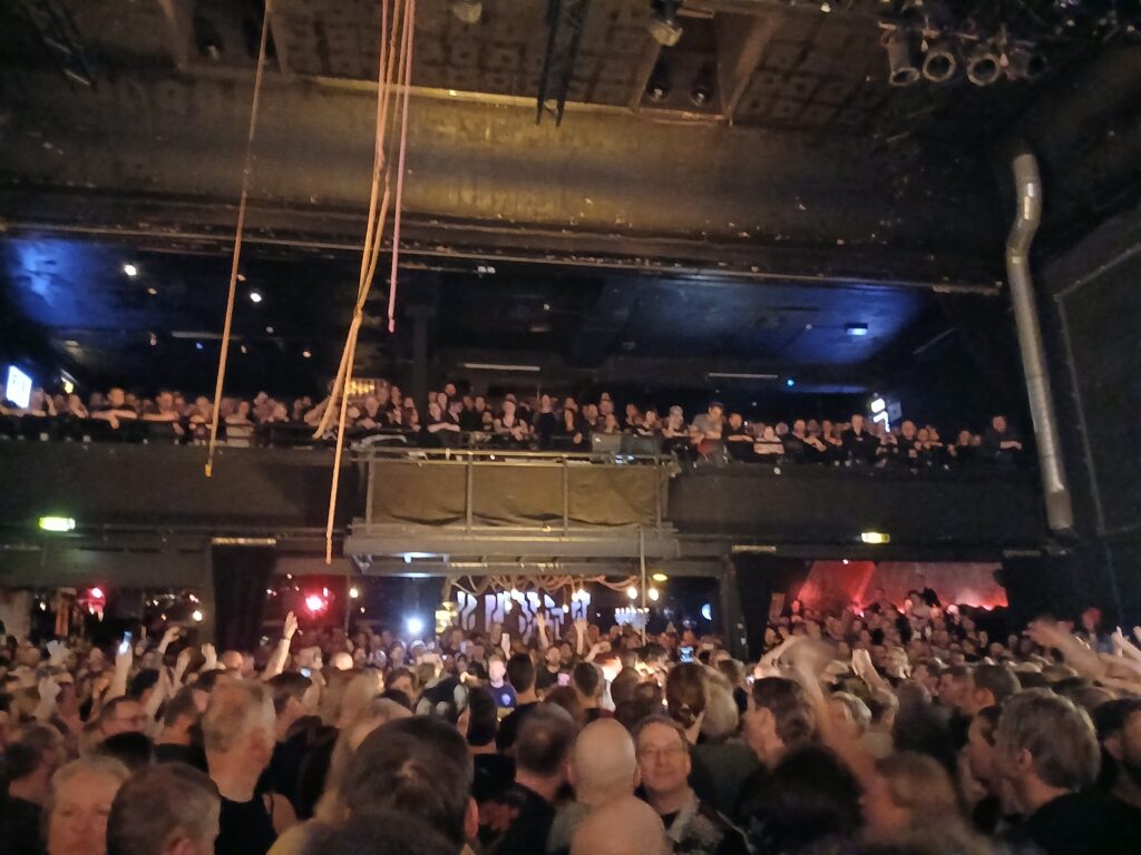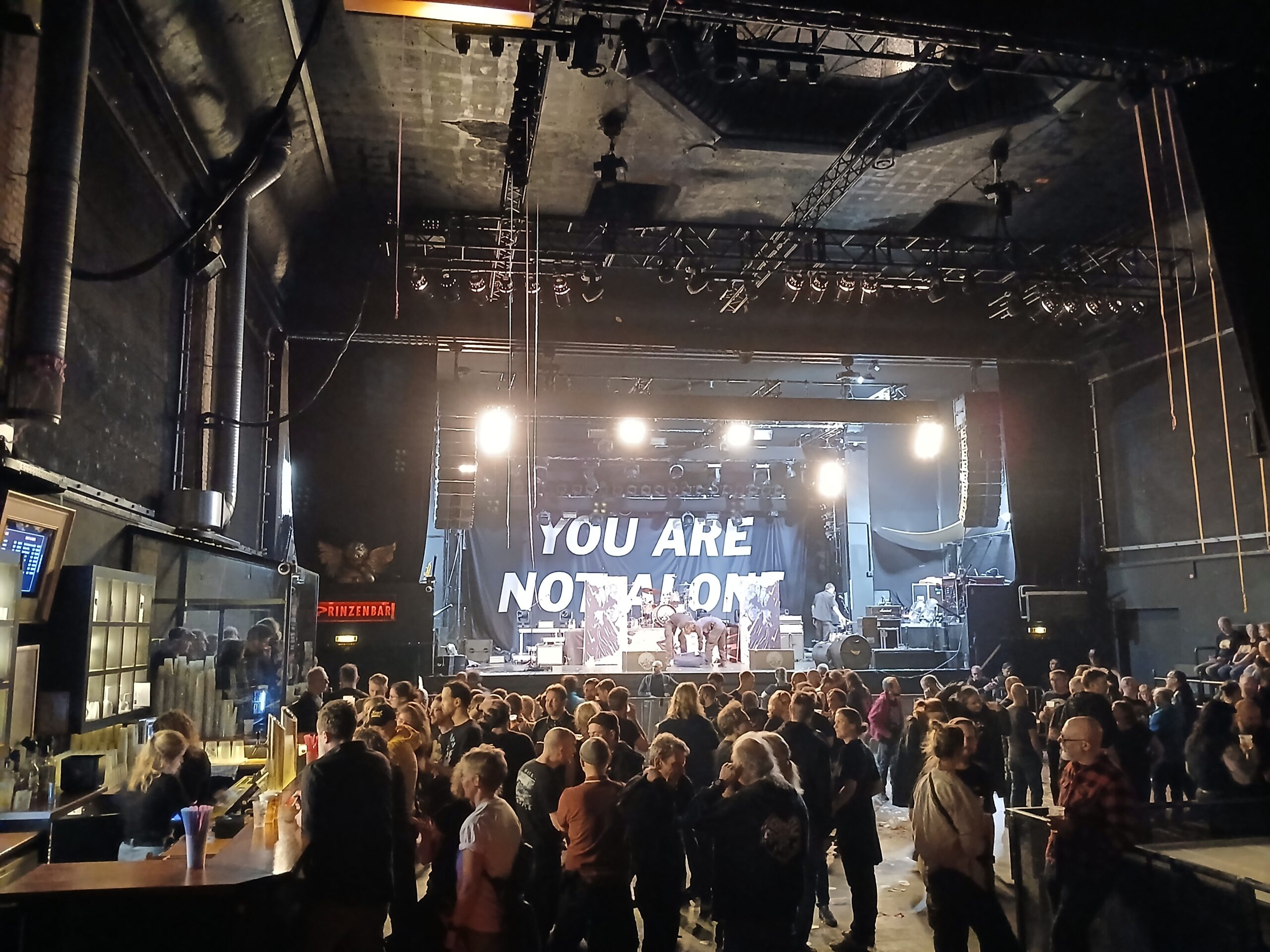Das Docks ist der größte herkömmliche Musikclub in Hamburg, mit einem Fassungsvermögen von 1250 bis 1500 Zuschauern. Optisch ähnelt es, wie vom Namen her zu vermuten, den Innenräumen eines Schiffes. Die Toiletten sind quasi unten im Keller (vom Foyer) und die Garderobe ist oben auf der Tribüne. Die Treppe hoch zur Garderobe und die Treppe runter zum Klo sind direkt gegenüber zueinander. Dies sorgt vor und nach der Show gerne mal für etwas Chaos. Wenn mal allerdings (wie wir heute) pünktlich da ist, ist man seine Jacke in der Regel schnell los. Das Personal am heutigen Abend macht auch einen super Job.