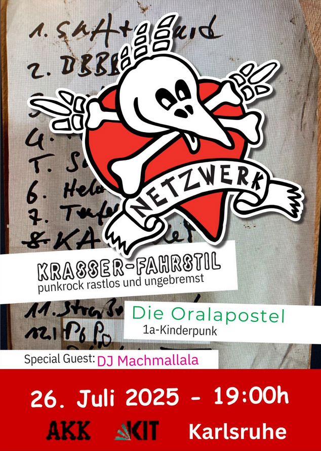 Am 26. Juli 2025 wird das AKK zur Punkrock-Zentrale, wenn Netzwerk, die legendären Punk-Helden aus Malsch, die Bühne entern. Und weil Punk bekanntlich am schönsten im Rudel ist, haben sie sich gleich noch zwei Hochkaräter eingeladen: Krasser-Fahrstil Punkrock, rastlos und ungebremst! Wer hier stillsteht, hat die Musik nicht verstanden. Die Oralapostel – für alle, die nie erwachsen werden wollen (oder es schon lange nicht mehr sind). Doch damit nicht genug: Nach dem Konzert wird’s richtig wild, denn DJ-Legende Machmallala schmeißt die After-Show-Party. Hier trifft Punk auf Plattenteller – und garantiert niemand auf Langeweile. Los geht’s um 20 Uhr. Kommt vorbei, bringt eure Freunde mit und lasst uns gemeinsam das AKK (www.akk.org/) in einen Punkpalast verwandeln! Spikes polieren, Tanzschuhe schnüren und ab geht die wilde Fahrt! Punk’s not dead – und am 26. Juli lebt er besonders laut in Karlsruhe!