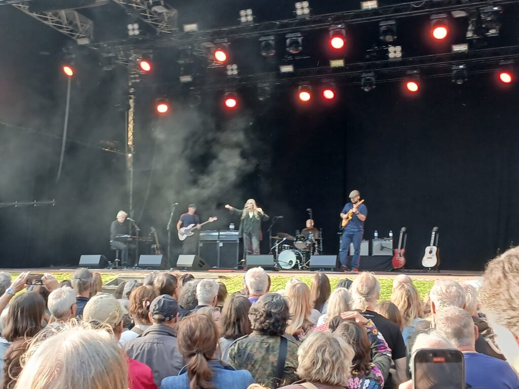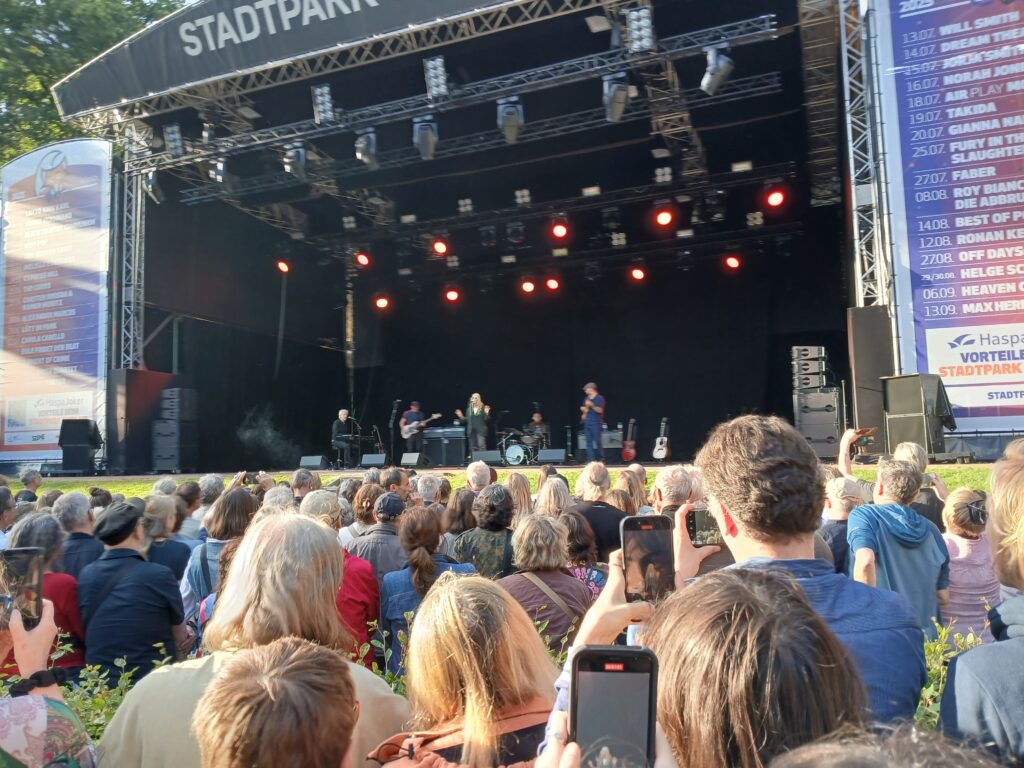 Bereits eine halbe Stunde vor offiziellem Beginn ist die „Wiese“ fast schon komplett voll mit Leuten. Sie geht abschüssig von oben runter zur Bühne. Wir ergattern noch einen Platz fast ganz unten. Vorteil, wir werden der Künstlerin ziemlich nah sein. Möglicher Nachteil, wir sind klein. Sprich jeder Mensch über 1,70, der sich vor uns stellt, wäre eine mögliche „Gefahr“ in Sachen freier Sicht. Wir sehen dann am Ende ganz gut.