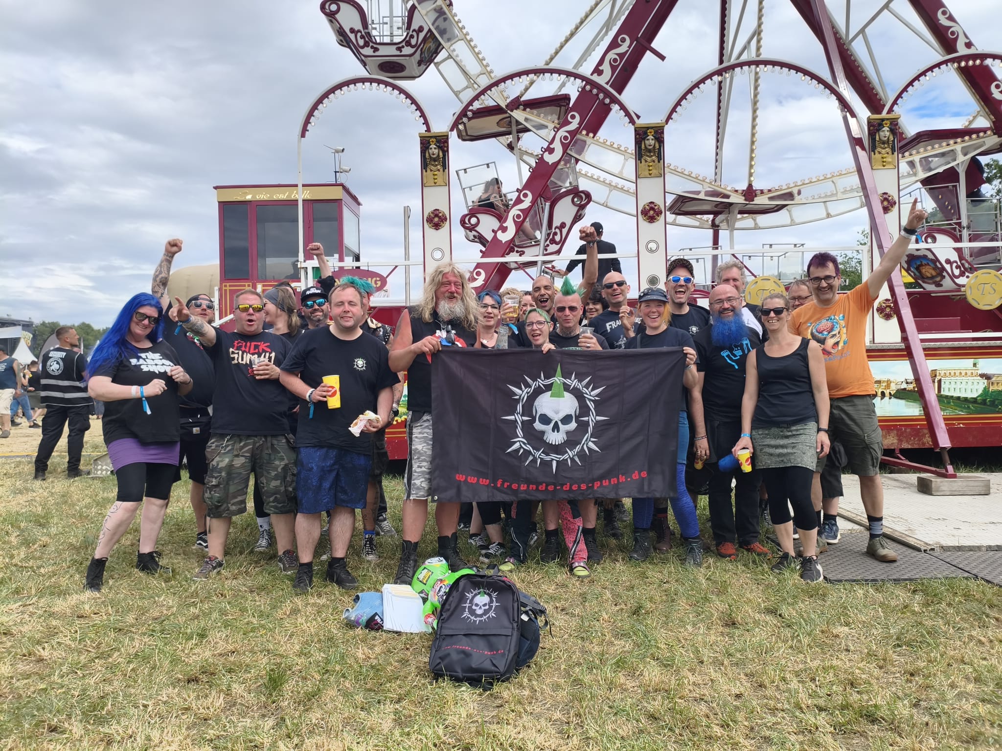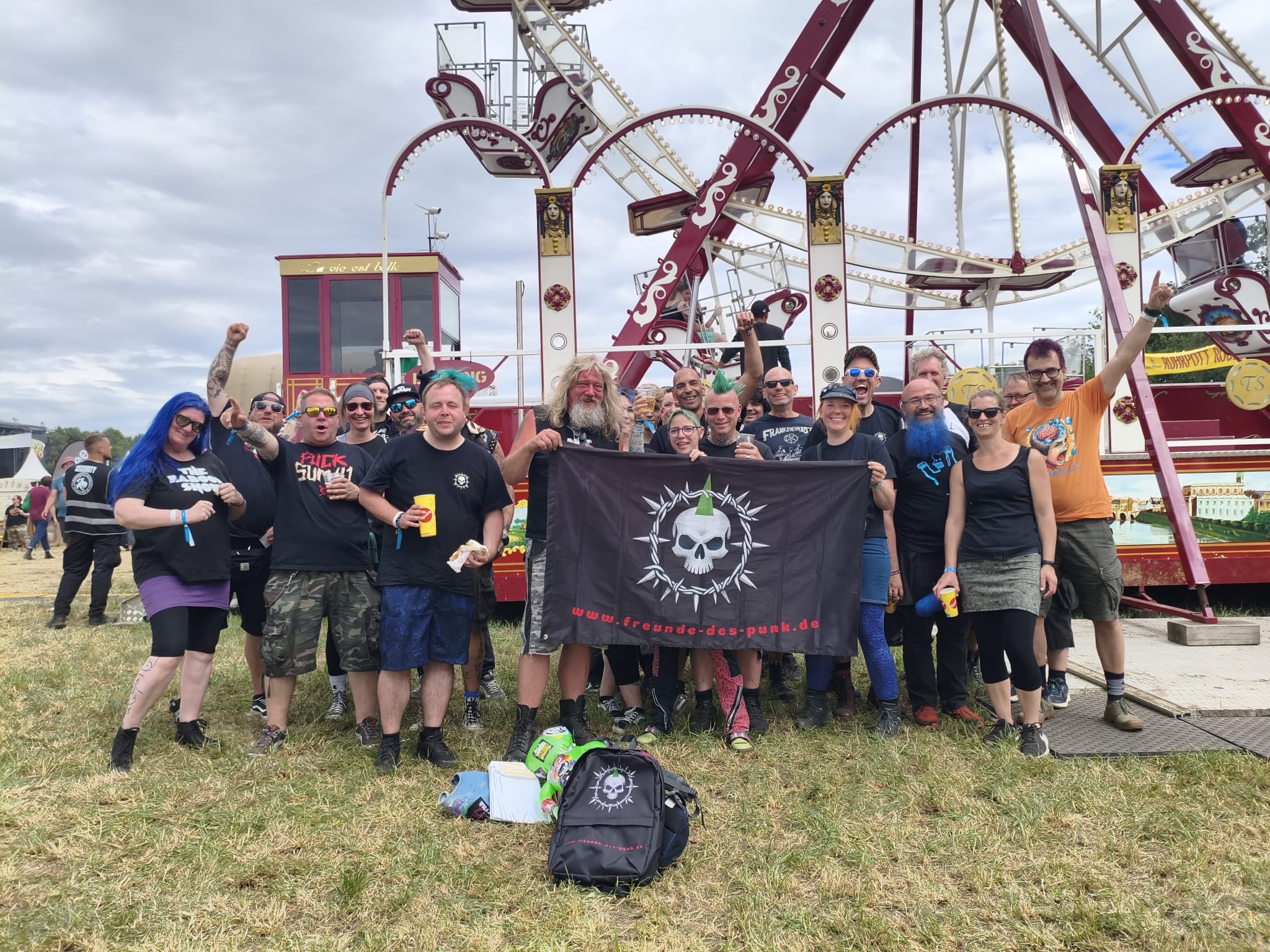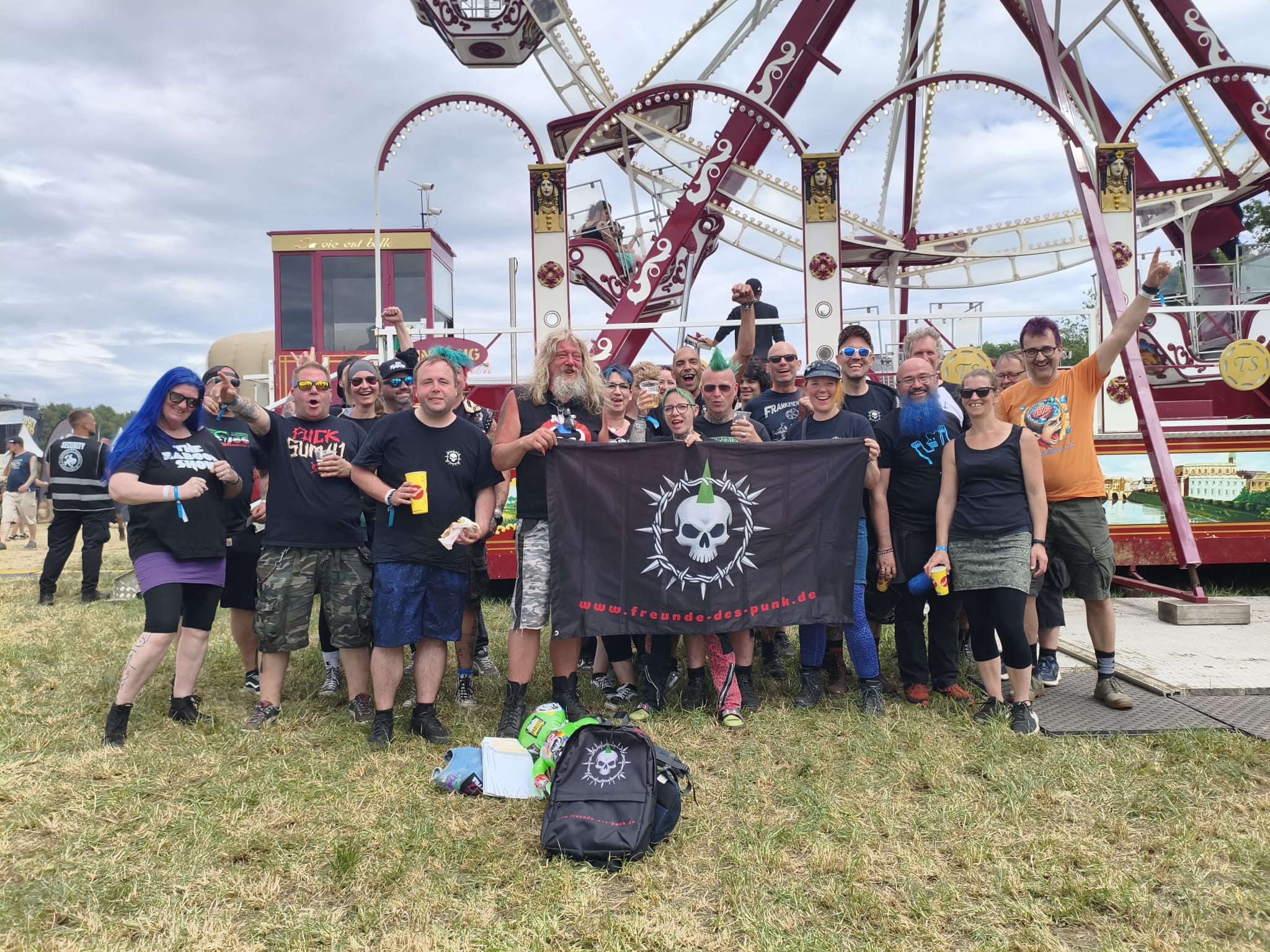 Alex Schwers hat mit seinem großen Team dieses Fest komplett im Griff. ALLE waren engagiert, gechillt und gut gelaunt, Respekt! Wenn ein Veranstalter ein Riesenrad hinstellt; OK, ist sein Fest! „Kindheitstraum erfüllt“, sagte er selber über die angekarrten Dinos. Hab ich dann eben mit zahlreichen Bieren mitfinanziert… Umgerechnet auf eine Halbe 6 EURO, das sind 24 Mark für die Maß!! 😉 Dafür waren die Spülklos frei. Das ist nicht selbstverständlich. Auch hier mitgedacht: Keine Zahlung – keine Schlange. Dass bei so einem Festival nicht der ökologische Gedanke im Vordergrund steht, ist außer Frage. Und da die meisten von uns das „große Besteck“ in Form von Caravans und anderen komfortablen Lösungen auffahren, (s. knappe Stellflächen) braucht keiner groß rumkritisieren. Früher: 5 Leute in 1 Karre, 2 Zelte, fertig. Heute: 1-2 Leute pro Gefährt. Vielleicht am Ende noch ein Wunsch: Lasst das Festival nicht zum „Rock im Park für Punkers“ werden. Es ist ok, mal aufs Dixi zu gehn und es ist OK, kein Netz zu haben. Geniest die Einfachheit und somit die Freiheit an solchen Tagen.