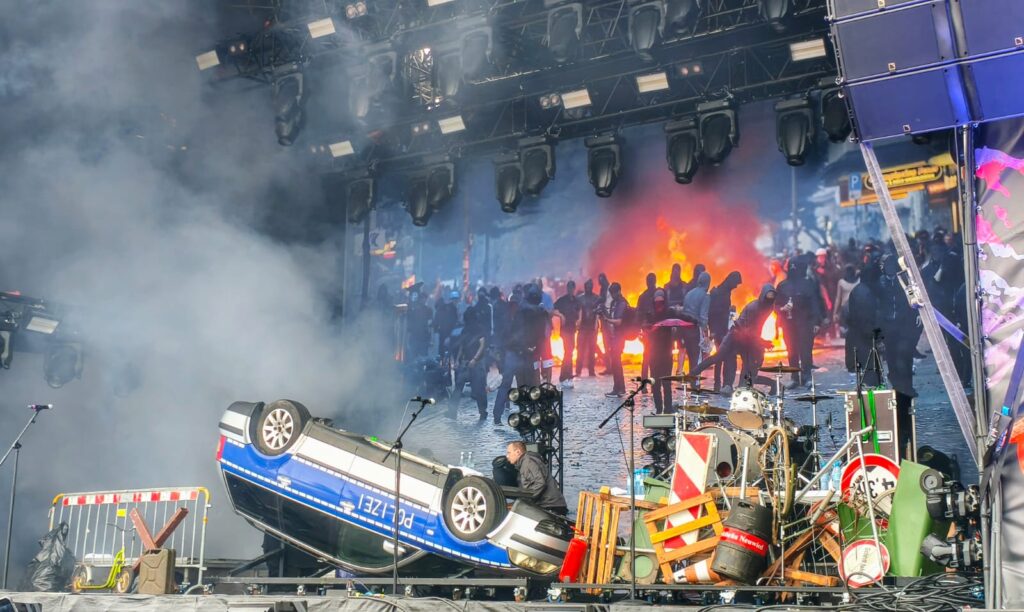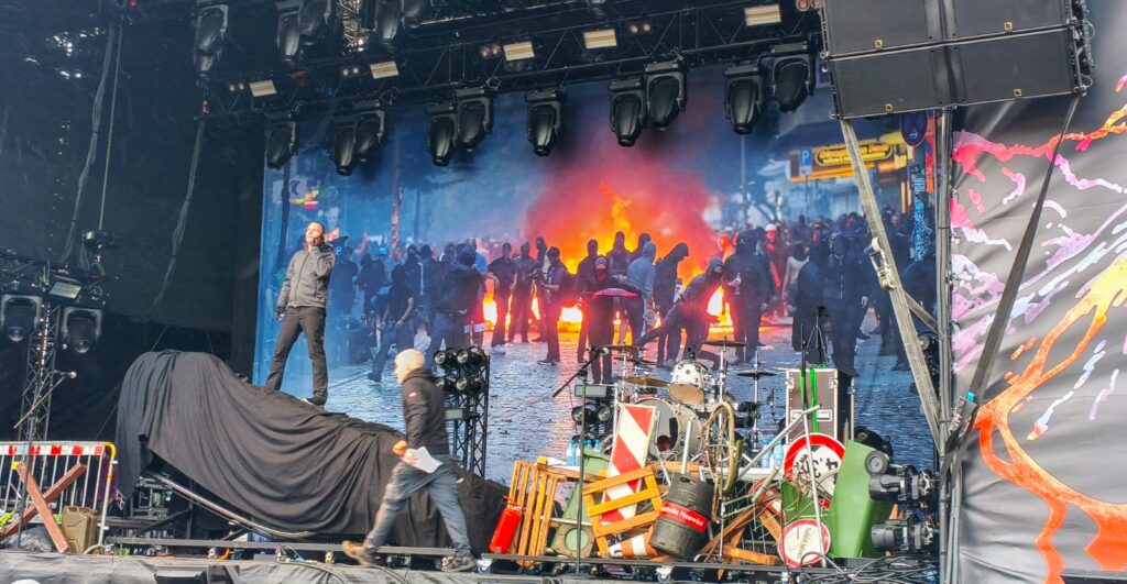 Wir haben den Aufbau des Bühnenbildes beobachtet, welches nach und nach Gestalt annahm. Das Transparent im Hintergrund war schon richtig geil, mit der Riot-Stimmung und dann kam ne Ladung Sperrmüll, hinter dem sich ein Schlagzeug versteckte. Ah ok, ne Barrikade und kein Spermüll, scheiß Kurzsichtigkeit 😛 Schließlich ein großes, schwarz verhülltes Objekt.