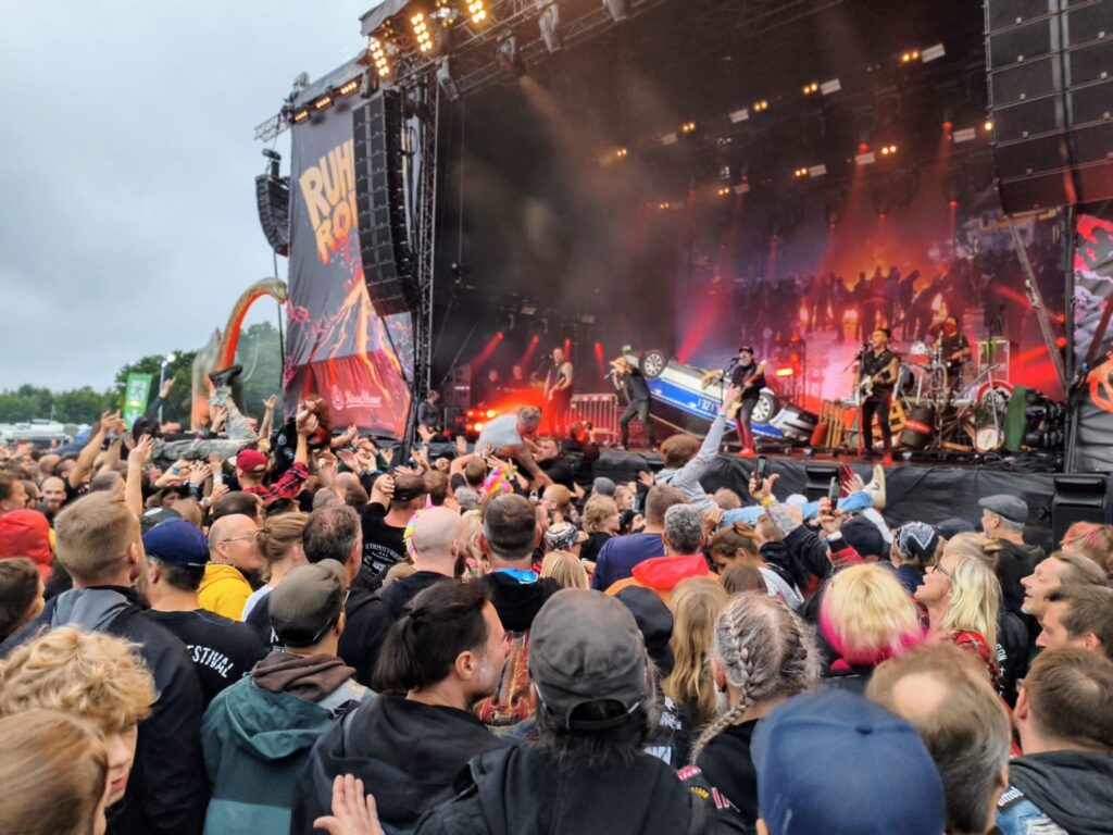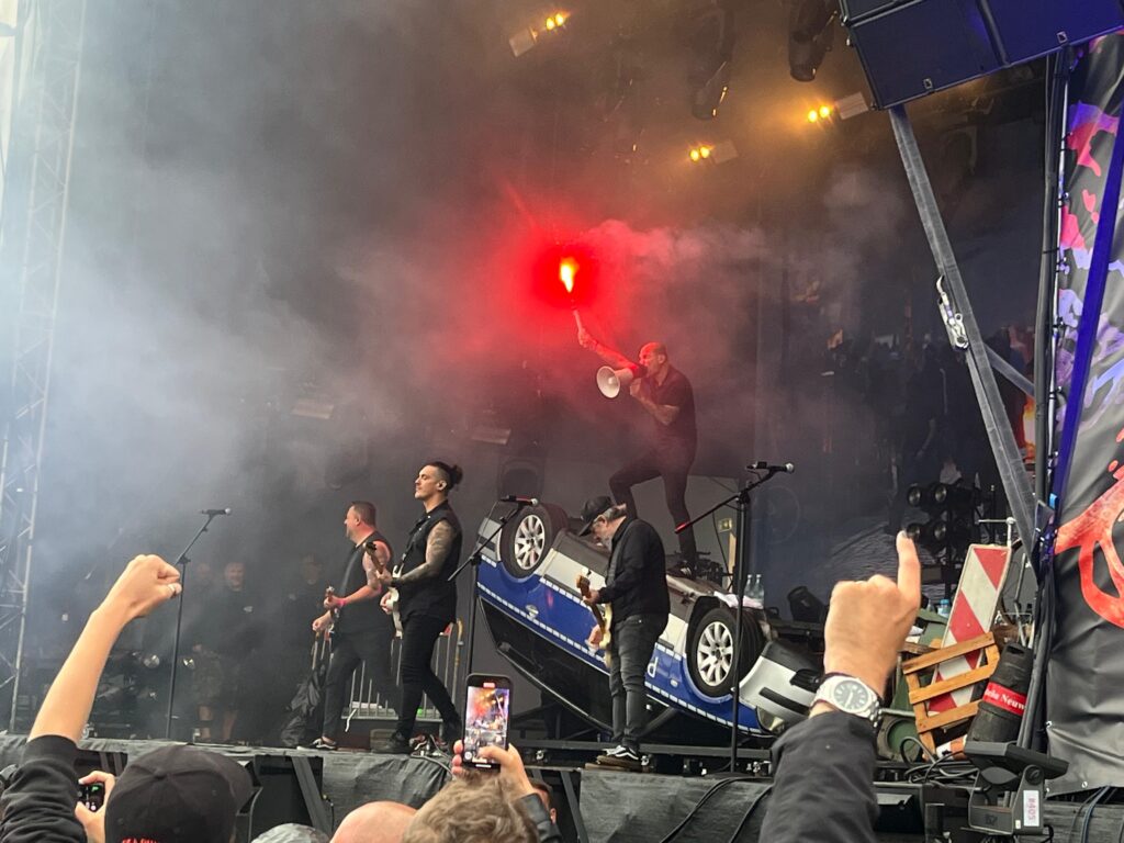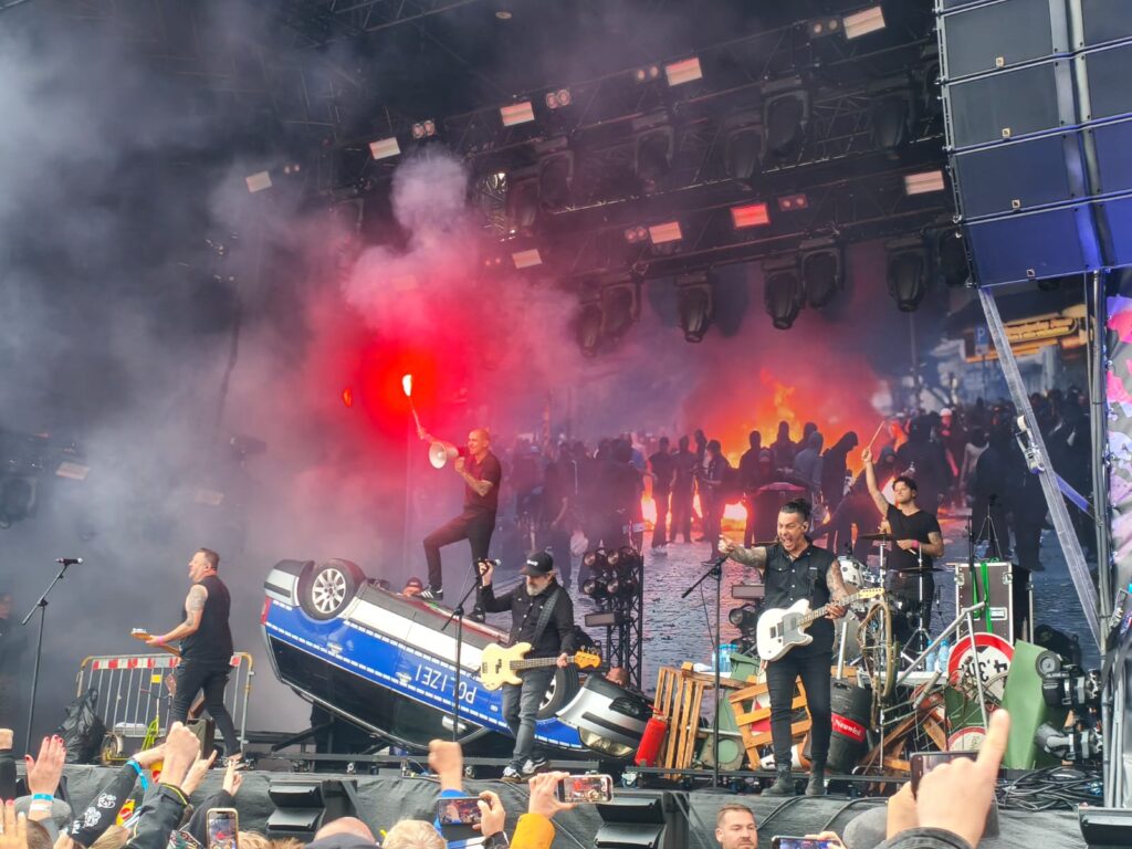 Und dann wurde das verhüllte Geheimnis gelüftet, eine umgeworfene Bullenkarre und die Show ging los. Leck mich am Allerwertesten, was für ein Auftakt. Pyrotechnik auf der Bühne und im Publikum, überall Flaggen und ein Monstersound fegt über den Platz vor der Bühne. Neben uns wird überall gejubelt, getanzt, gegrölt und gefeiert.