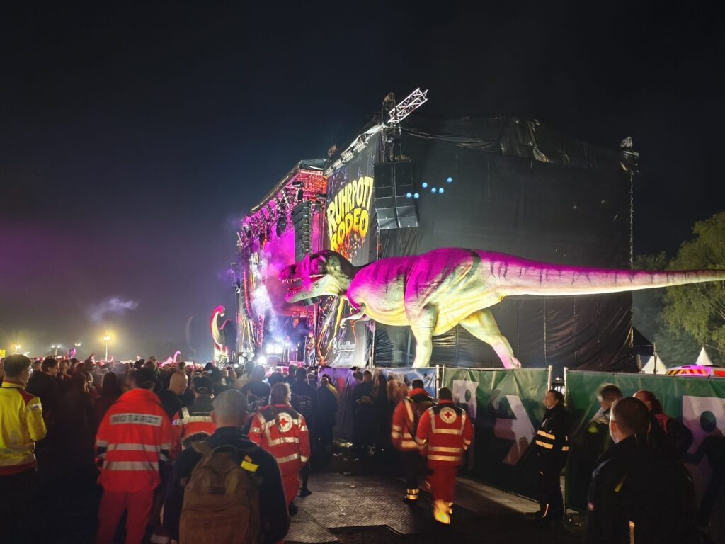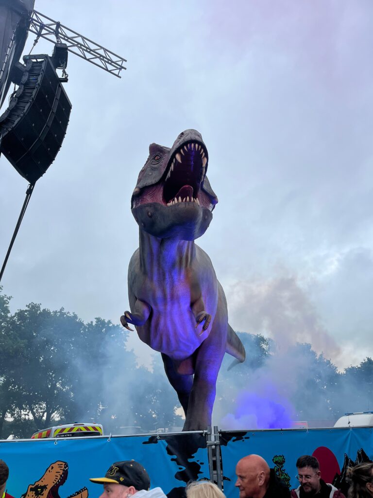 Die Toiletten sind für Festivalverhältnisse echt sauber, die Duschen sind auch okay. Das Essen an den zahlreichen Ständen ist erstaunlich gut. Ich empfehle das Chili con Carne. Es sei denn, man plant hinterher, Rum Cola zu trinken. Dann lieber nicht. Ach ja, lebensgroße Dinos gab es zu beiden Seiten der großen Bühne auch noch. Die waren toll. Sogar ein Riesenrad wurde angekarrt; naja wer es mag.