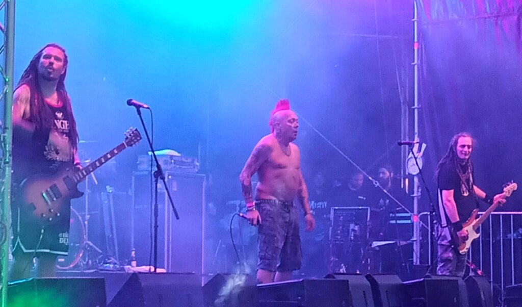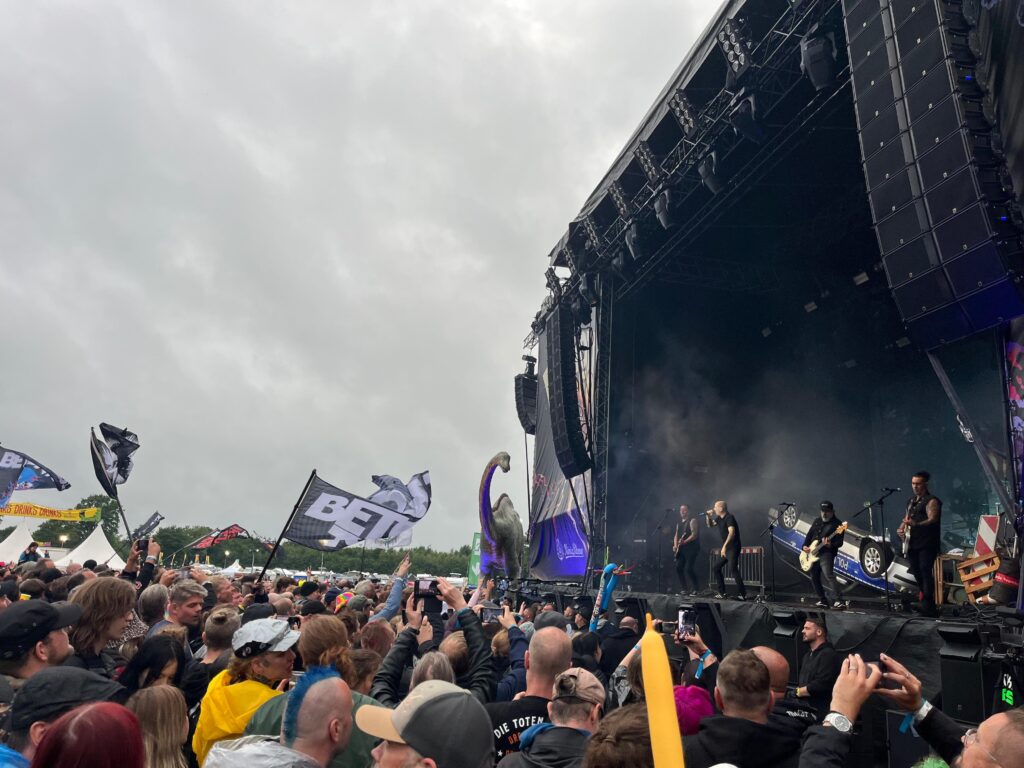Auf jeden Fall befinde ich mich bei den Punk Rock Veteranen aus Rheinberg wieder vorne im Pit. Anno 1990 gegründet und noch immer nicht müde. Dafür wirken die Leute um mich herum müde… und ich bin es auch. Der Moshpit will nicht so richtig in Schwung kommen. Sie spielen fast nur neuere Lieder. Es fängt noch gut an mit „Keine Popsongs“. Aber dann „fordern“ sie auf zu einer Wall of Death für „Tanz im Algorithmus“ vom aktuellen Album „Zeig dich“. Das hilft uns einfach nicht weiter auf dem steinigen Weg zur Escalation. 😉