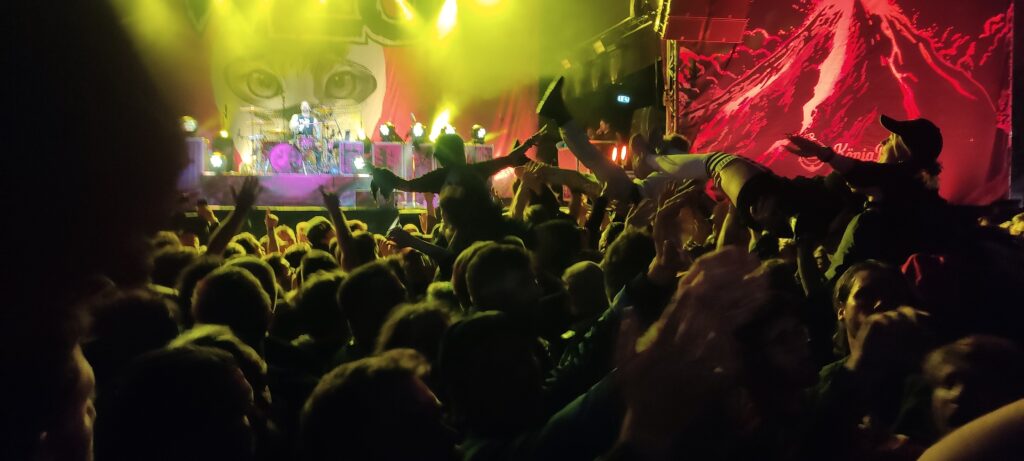 Sega: Ab Sekunde eins der absolute Knaller. Wir hatten einen guten Platz, direkt hinter dem sofort gestarteten Pit. Und es hat auch keine fünf Minuten gedauert, bis ich das erste mal mitten drin war. Und siehe da, auch viele der alten und neuen Bekannten waren entweder direkt im oder neben dem Pit und so wurde hier schon freudig und ausgelassen gefeiert, gepogt und gelacht. Die ganze Show war einfach nur der Hammer und hat mich so aufgewärmt, dass mein Pullover fast wieder trocken ist.