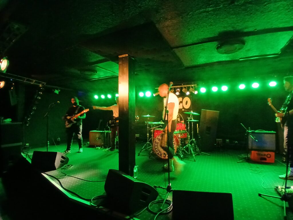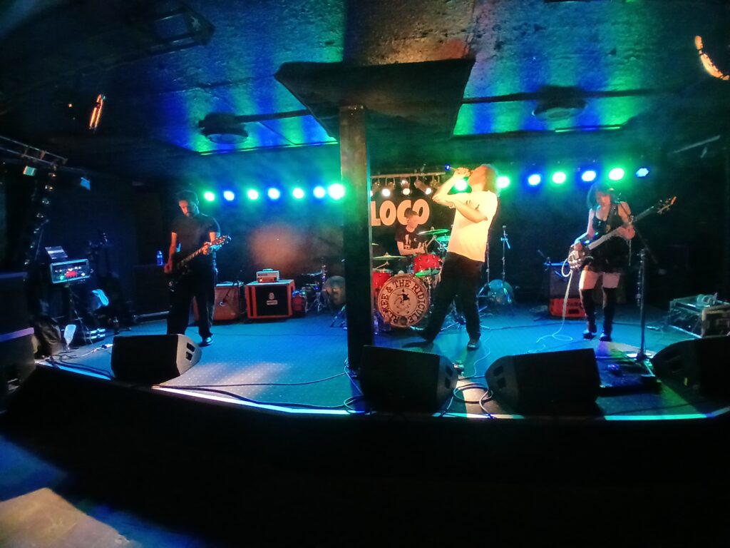 Trotzdem schmeckt der erste Alkohol der Woche fantastisch und ich schaue mir die Szenerie an. So richtig voll ist es leider heute Abend nicht in der selbst erklärten „heißesten Sauna“ von ganz Hamburg. Ein Teil vom Saal ist mit einen Vorhang verdeckt. Das ist leider hier schon ein deutliches Indiz für ausbleibende Zuschauer. Es passen laut Recherche ca. 450 Leute ins Logo. Ich würde schätzen, heute ist es vielleicht halb voll. Was natürlich für alle Besucher die da sind, auch angenehm ist, da es hier ansonsten gerne mal eng wie in einer Sardinenbüchse und heiß wie eben in einer Sauna werden kann. Zudem kommt man heute jederzeit gut zur Bar und zum Klo. Die Seele freut sich. Portemonnaie und Leber vergießen die eine oder andere Träne 😉