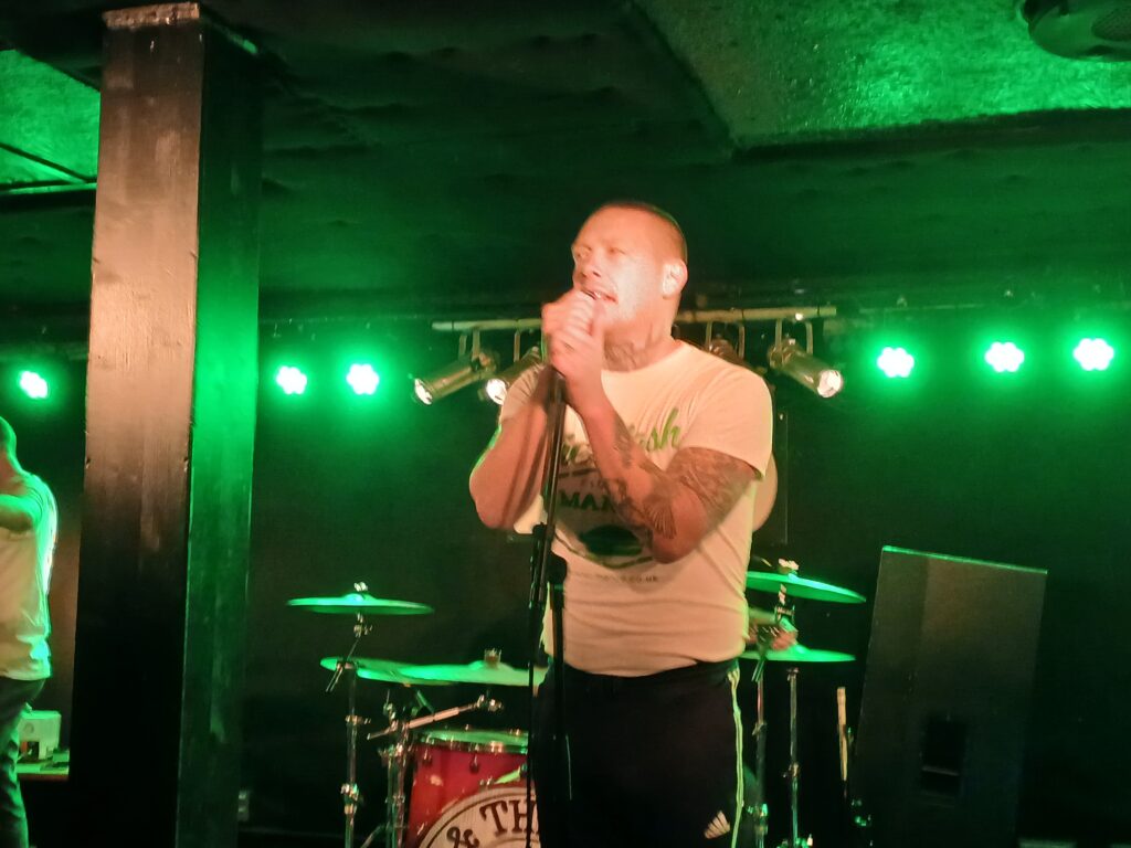 Ich lass mich nicht lange bitten und suche in der ersten Reihe „Verbündete“ für Pogo und Eskalation. Problem dabei, es sind wie schon erwähnt nicht so viele Leute da. Allerdings haben die Menschen die da sind, dafür zum Glück richtig Energie mitgebracht. Ich verbrüdere ich mich mit einem Briten, Typ Hooligan in seinen späten 40ern. Der beweist seine Textsicherheit und freut sich über einen „Tanzpartner“. Wir liegen uns schon nach wenigen Songs in den Armen und er zeigt mir ein Tattoo der Band auf seinem Arm.