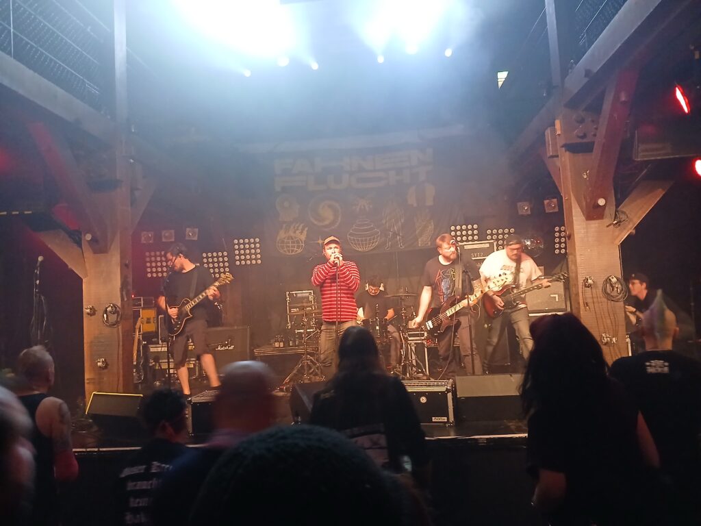 Nun wird es wieder sehr politisch, mit dieser schon seit Mitte der 90er Jahre aktiven Combo aus Rheinberg. Ich habe sie schon 2-3 Mal gesehen und war immer sehr begeistert. So auch heute! Wir starten einen kleinen aber feinen Moshpit und die Jungs liefern den perfekten Soundtrack dafür. Es gibt eine bunte Mischung von neueren und älteren Liedern zu hören. Lieder wie „Schöner Scheitern“ oder „Staub“ vom aktuellen Album „Molotow Zitrone“ funktionieren dabei genauso gut wie die Klassiker. Soundtechnisch durchaus melodisch, doch in Sachen Wucht und Geschwindigkeit geht es in die Hardcore Richtung. Dabei gilt wie schon bei Kodder, klare Ansagen; kein Bullshit.